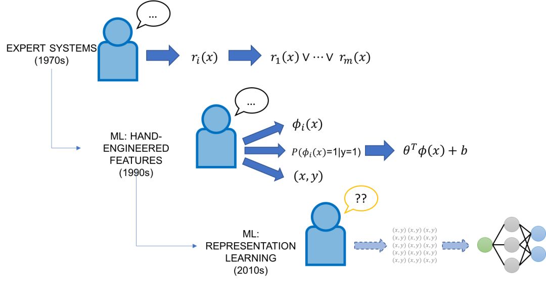 经典的 (非表示学习)ML 方法通常有两个领域专家输入端口。首先,这些模型通常比现代模型的复杂度要低得多,这意味着可以使用更少的手工标记数据。其次,这些模型依赖于手工设计的特性,这些特性为编码、修改和与模型的数据基本表示形式交互提供了一种直接的方法。然而,特性工程不管在过去还是现在通常都被认为是 ML 专家的任务,他们通常会花费整个博士生涯来为特定的任务设计特性。