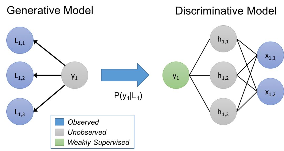3. 生成模型输出一组概率训练标签,我们可以使用这些标签来训练一个强大、灵活的判别模型 (如深度神经网络),它将泛化到标记函数表示的信号之外。