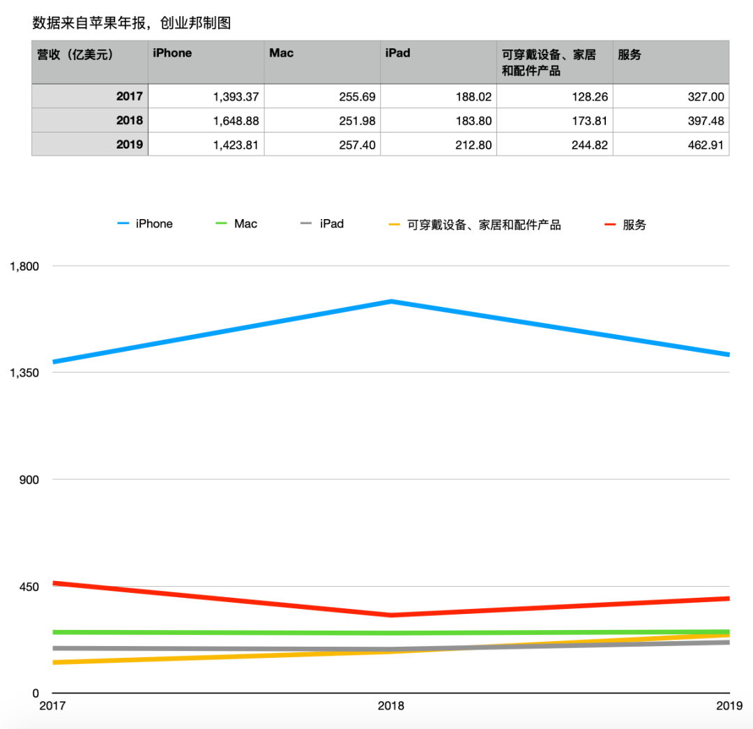 其中一个有意思的变化是,苹果在去年的年报中,开始更加强调可穿戴设备。此前财年年报中的“Other Products”变成了“Wearables, Home and Accessories”(可穿戴设备、家居和配件产品),这一类别表现抢眼,营收244.82亿美元。同比2018年增长41%。具体数据如下图: