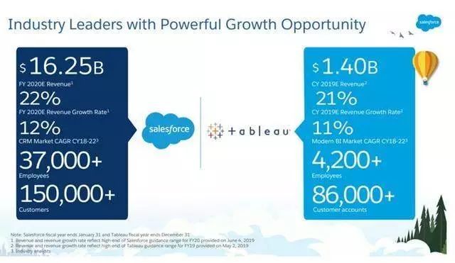 而对 Salesforce 来说,这笔交易不仅将使得 Salesforce 2020 财年总营收增加 3.5 亿-4 亿美元。在完成收购后,Tableau 还将会与 Salesforce 的 Einstein 人工智能自动化平台配对,可以为企业级、部门级的需求提供智能、直观的分析和可视化平台,扩展 Salesforce 的产品能力。Tableau 也让 Salesforce 成为首批将机器学习应用于 CRM 的公司之一。最后,Salesforce 承担全渠道销售和营销的平台 Customer 360 可以基于 Tableau 的全局信息可视化能力,提升现有产品能力。(来源:美股研究社、IPO 早知道、极客公园)