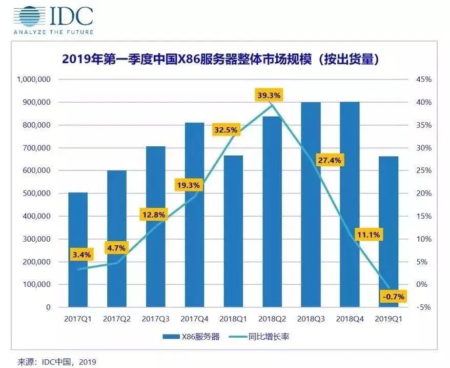 IDC《2019 年第一季度中国 X86 服务器市场跟踪报告》显示,2019 年第一季度中国 X86 服务器市场出货量 662,504 台,同比下滑 0.7%;市场规模 35.90 亿美元(约合 240.90 亿元人民币),同比增长 13.5%。2019 年第一季度中国 X86 服务器市场遇冷,出货量同比增速自 2010 年以来首次出现负增长,不过由于均价持续攀升,销售额仍达到两位数增长。