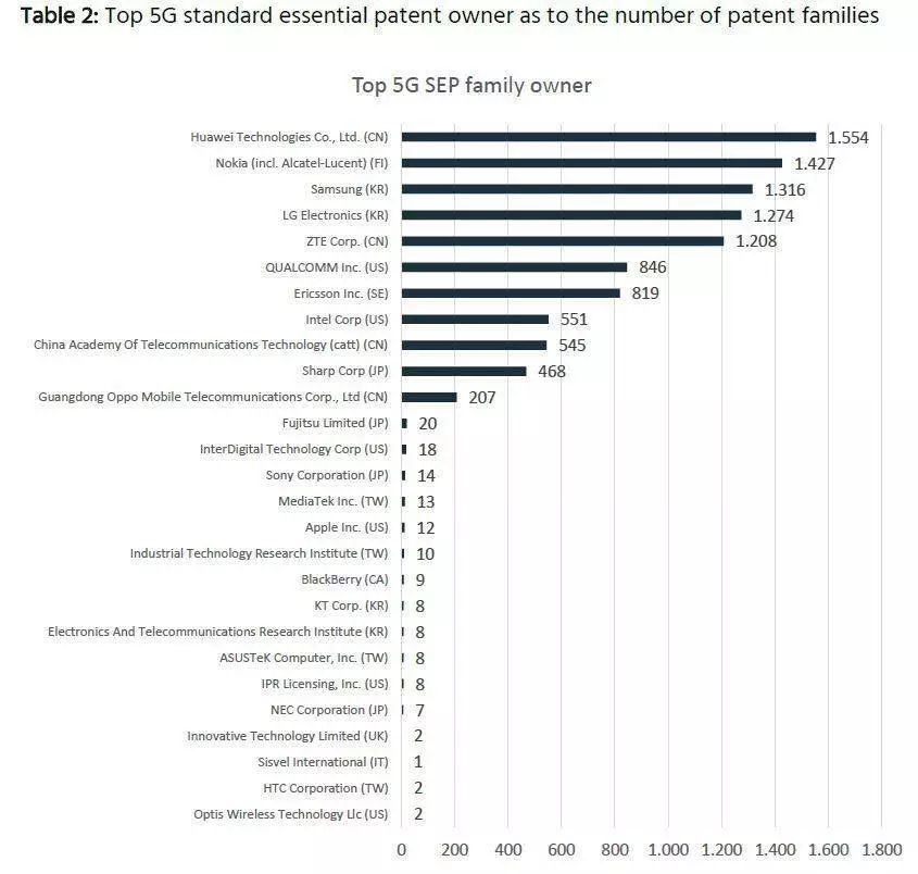 华为拥有 1554 个 5G SEP,诺基亚、三星、LG 紧随其后,另外一家中国公司中兴也拥有 1208 个 5G SEP,排名第五,比排名第六的高通要了将近 50%。拥有大量 SEP 的公司可以获得可观的特许权使用费收入,并使他们的基站、智能手机和其他设备在价格上更具竞争力。IPlytics 首席执行官 Tim Pohlmann 表示,由于华为拥有 5G 技术的大部分知识产权,即使不能在美国销售产品,它也可以在美国赚取专利费。(来源:快科技)