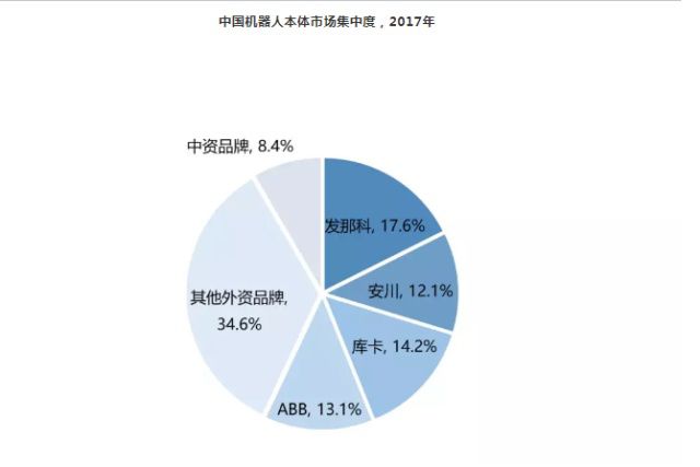 值得一提的是,目前国内本土工业机器人公司市场占有率仅为三成左右。全球最大的企业增长咨询公司弗若斯特沙利文 2019 年 3 月发布的《中国工业机器人行业产业链概览》显示,中国机器人市场被以」四大家族」——发那科、库卡、ABB、安川电机为代表的外资企业占据,国产品牌技术方面处于弱势。2017 年国产品牌市场份额由 2016 年的 33.2% 下降至 27.3%,2018 年上半年国产机器人本体销量有所回升,达到 29.5%。(来源:界面、上游)