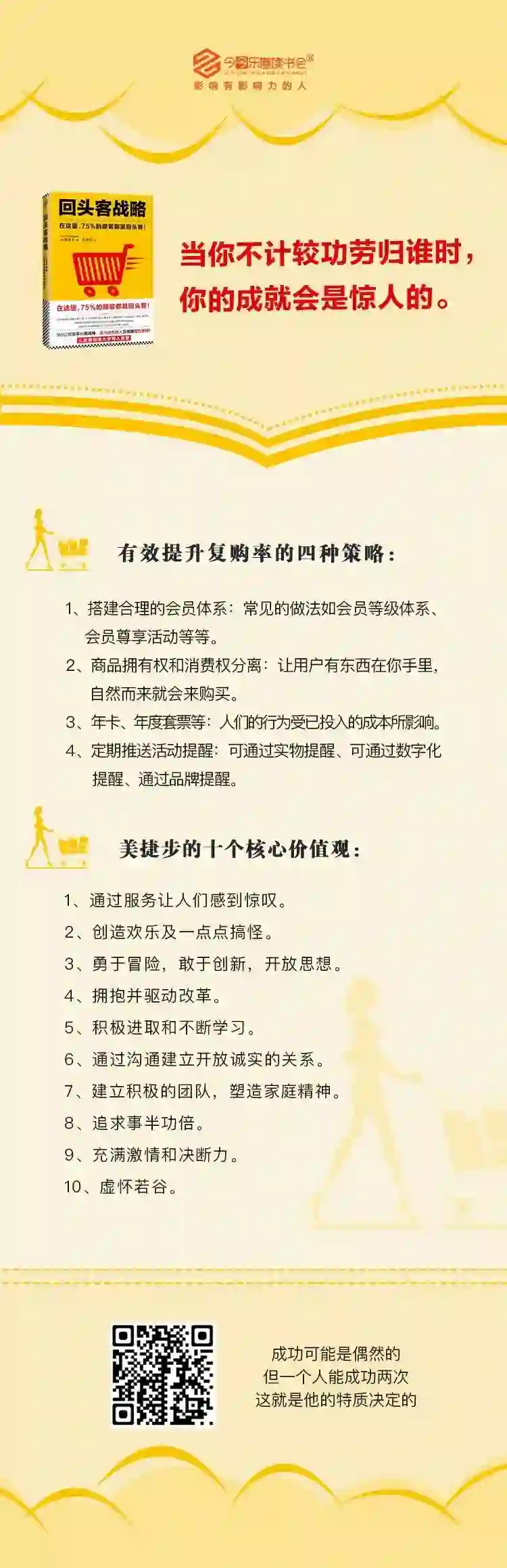 《回头客战略》一书讲述了美捷步是如何通过提高客户服务和体验,让回头客的口碑为企业免费宣传的。如果你想进一步了解美捷步如何创造从0到10亿美元的销售神话,如果你想学习流量时代最“实惠”最管用的营销方法,那么,你一定要读一读这本《回头客战略》。