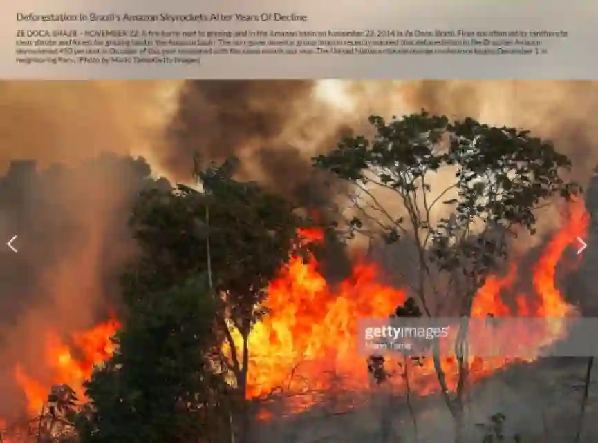 下面这张所谓的“现场照片”,拍摄的亚马孙雨林边缘的牧场火灾。它发生的时间是2014年,由摄影师Mario Tama拍摄。