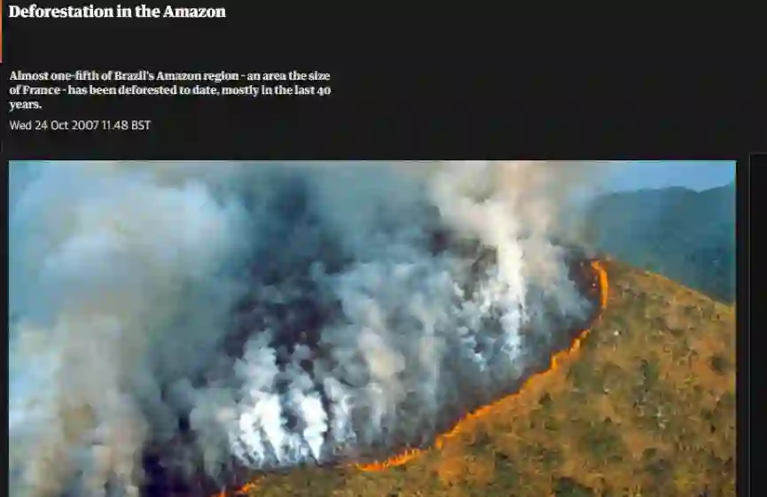 下面这张图拍摄于1989年,拍摄方为法国摄影机构Sipa Press。2007年,它曾出现于《卫报》一篇关于亚马孙雨林砍伐的文章之中。