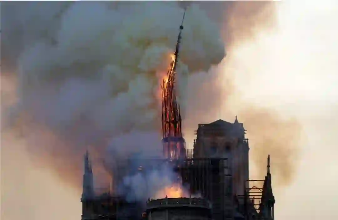 大火中的巴黎圣母院,塔尖折断的一瞬间。