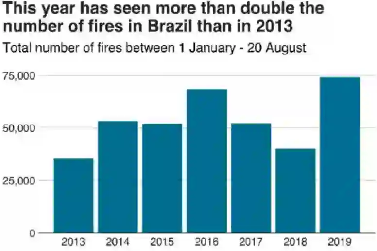 2013年至2019年1月1日至8月20日之间,巴西火灾发生数量柱形图。其中2019年火灾总数约为2013年火灾总数的两倍。数据来自NASA,图片来自BBC。