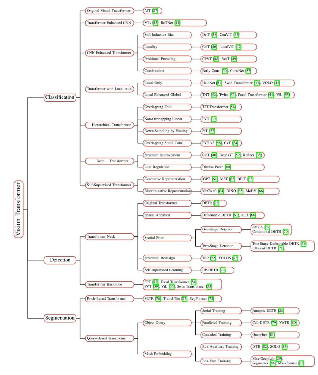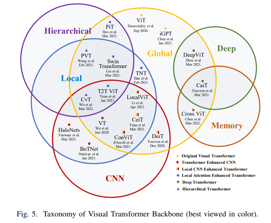 受 NLP 中 Transfomer 成功的启发 [2]–[5], [8],不少研究者尝试将 Transformer 引入图像分类任务。Vision Transformer(ViT)[27] 最先在主流分类基准上达到了可以媲美传统 CNN 的性能。在论文的第 III 章,研究者对 2021 年 6 月之前发布的 40 多个 Transformer 骨干进行了全面回顾,并根据动机和实现情况将其分成了六类,如下图 5 所示。