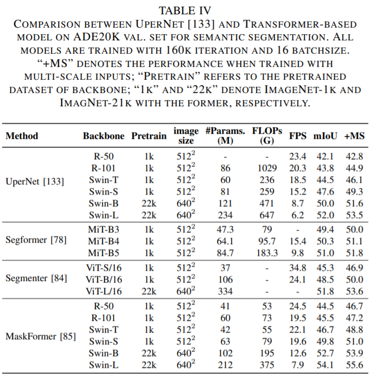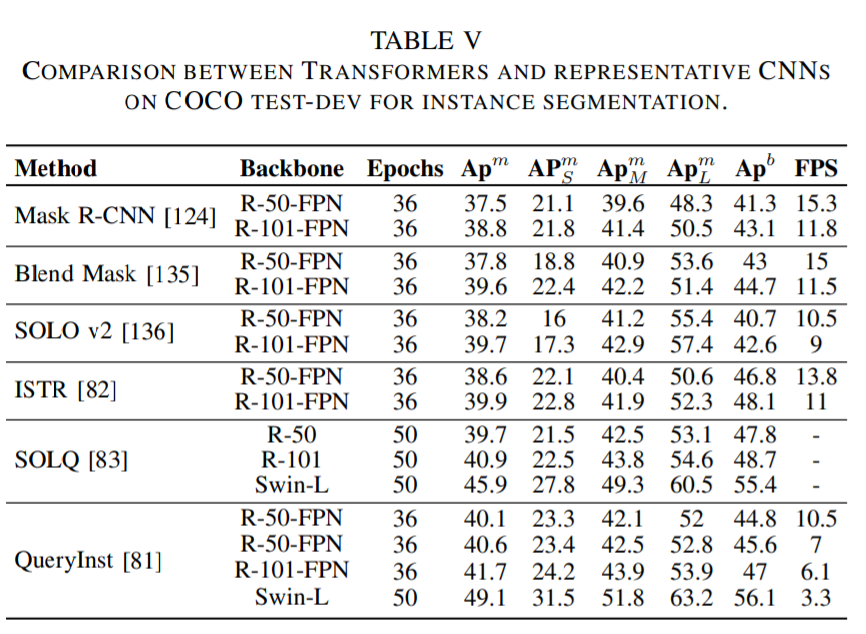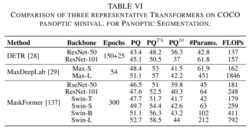 论文第 V 章主要介绍了用于分割的 Transformer。按照分割方式的不同,这些 Transformer 可以被分为两类:基于 patch 的 Transformer 和基于查询的 Transformer。后者可以进一步分解为带对象查询的 Transformer 和带掩码嵌入的 Transformer。下面这些表格展示了这些 Transformer 的性能数据。