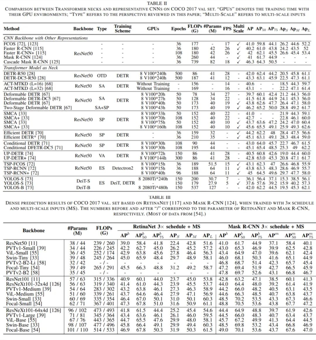 在第 IV 章中,研究者详细介绍了用于目标检测的视觉 Transformer。这些模型可以分为两类:作为颈部的 Transformer 和作为骨干的 Transformer。颈部检测器主要基于为 Transformer 结构指定的一个新表示,称为对象查询,即一组学习到的同等地聚合全局特征的参数。它们试图从加速收敛或提高性能的角度来解决最优融合范式。除了专门为检测任务设计的各种颈部外,一定比例的主干检测器也会考虑到特定的策略。最后,作者在表 II 和表 III 中比较了它们的性能,并分析了 Transformer 检测器的一些潜在改进。