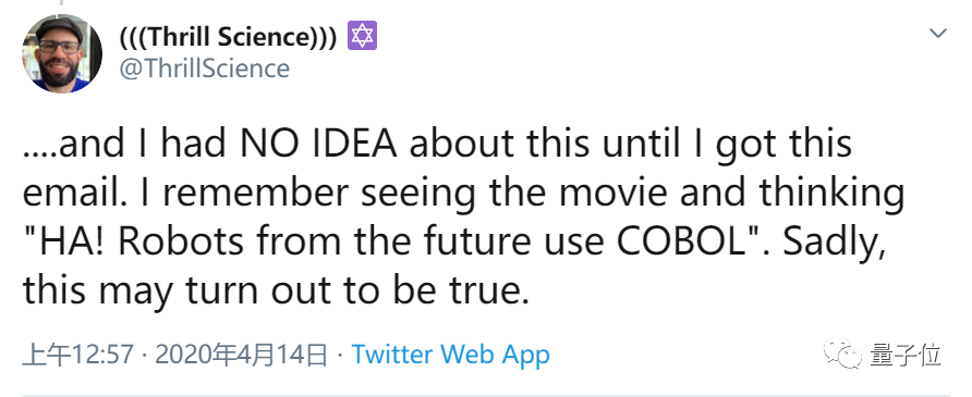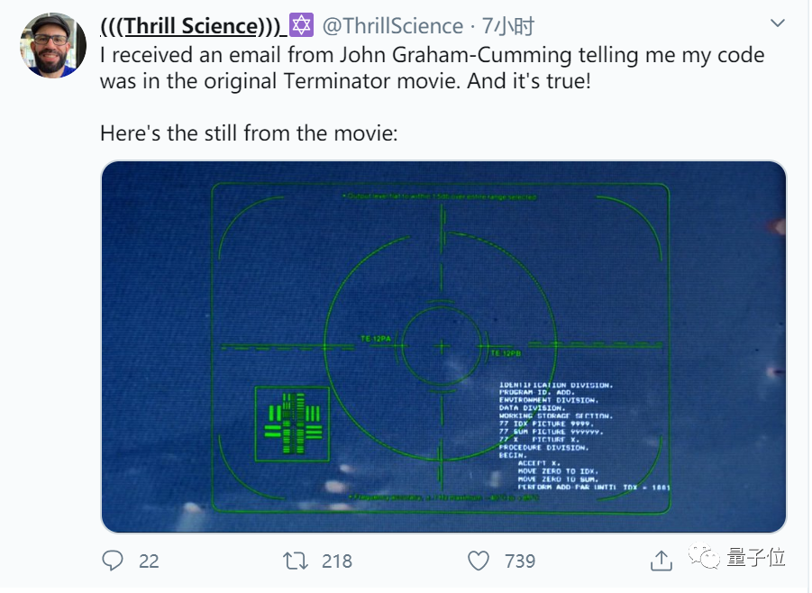 今天,Virtual Airwaves首席技术官Erlang在推特上表示,自己写的COBOL代码也出现了在《终结者》电影里。