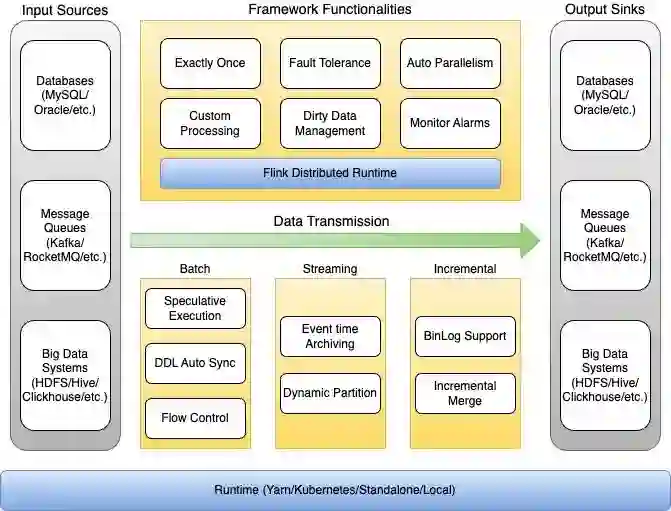 新引擎最初基于Apache Flink实现,历经多年持续改进和创新,现已具备批式集成、流式集成和增量集成三类同步模式,并支持分布式水平扩展和流批一体架构,在各种数据量和各种场景下,一个框架即可解决数据集成需求。此外,BitSail采用插件式架构,支持运行时解耦,从而具备极强的灵活性,企业可以很方便地接入新的数据源。