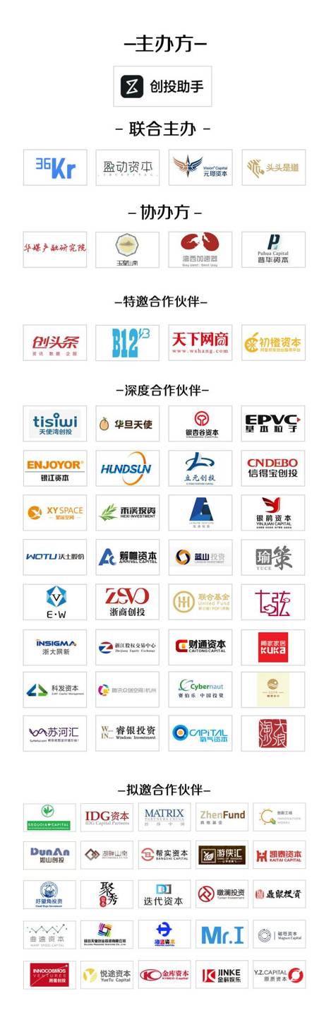TOP机构投资盛宴——阿里巴巴、蚂蚁金服、IDG资本、红杉资本、经纬中国、纪源资本GGV、真格基金、创新工场、盈动资本、元璟资本、头头是道、普华资本、华旦天使投资、银杏谷资本、基本粒子、天使湾创投、银江资本、初橙资本、乐奕创投、银鹃资本、禾溪投资、筹帷资本、浙大同创、沃土股份、瑜策创投、关瑞投资、立元创投、星沅创投、蓝山投资、浙商创投、联合基金、娱乐工场、七弦资本、浙大网新、浙江股权交易中心、财通资本、顾家家居投资部、科发资本、腾讯众创空间杭州、浙江赛伯乐、盛港投资等百家机构悉数到场。