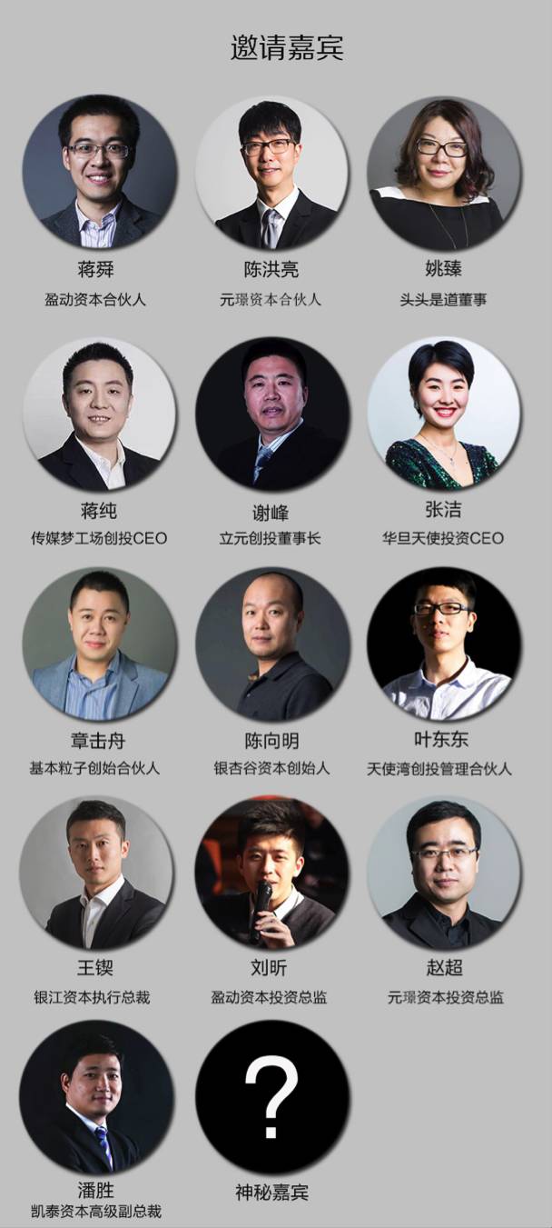 一线VC投资逻辑激烈碰撞——盈动资本蒋舜、元璟资本陈洪亮、头头是道姚臻、普华资本蒋纯、立元创投谢峰、华旦天使张洁、基本粒子章击舟、银杏谷陈向明、天使湾叶东东、银江资本王锲、盈动资本刘昕、元璟资本赵超、凯泰资本潘胜等到场分享。