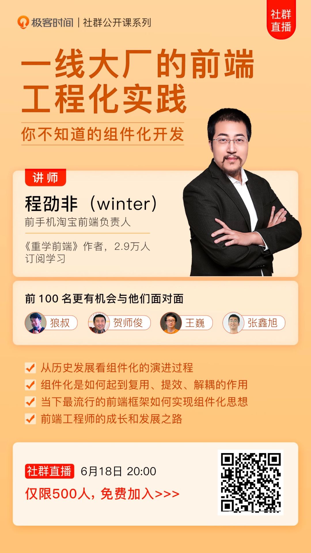 ⏰6 月 18 日社群分享,技能提升:《 一线大厂前端工程化实践 -- 你不知道的组件化开发 》