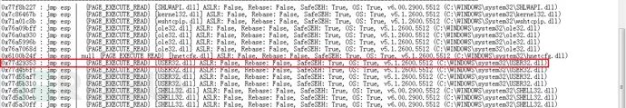 4.现有模块的JMP ESP指令使用User32.dll对应的地址7E3C56F7,但该模块是基于Windows XP Profesional SP3 Spanish x86编写的,在这里西班牙语的XP显然是不适用的。于是在ImmunityDebugger中使用命令!mona jmp -r esp查询合适的跳转指令,mona查询的结果保存在文件jmp.txt中,这里我们选择