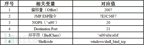 5.关于shellcode中的坏字符,可以在ImmunityDebugger中使用mona插件辅助确定。这里我们使用一种原理性的方法来找出坏字符,虽然过程有点繁琐,但是准确性较高。测试代码如下所示(其中变量shellcode赋值为所有可能出现的字符):