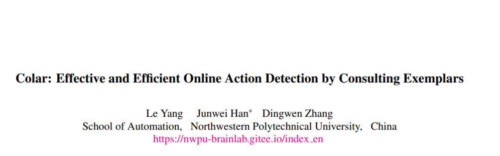 杨乐,韩军伟,张鼎文. Colar: Effective and Efficient Online Action Detection by Consulting Exemplars, CVPR 2022.
