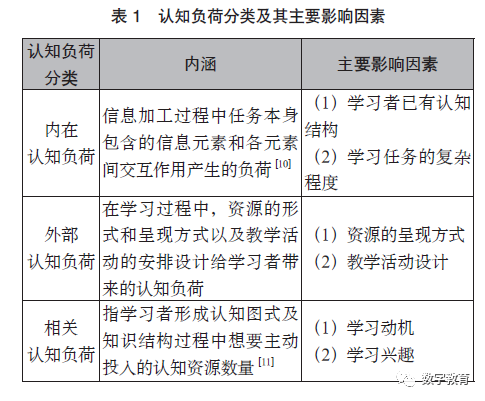 Sweller 将认知负荷分为三类:内在认知负荷、外部认知负荷和相关认知负荷[9],认知负荷的分类及其主要影响因素如表1 所示: