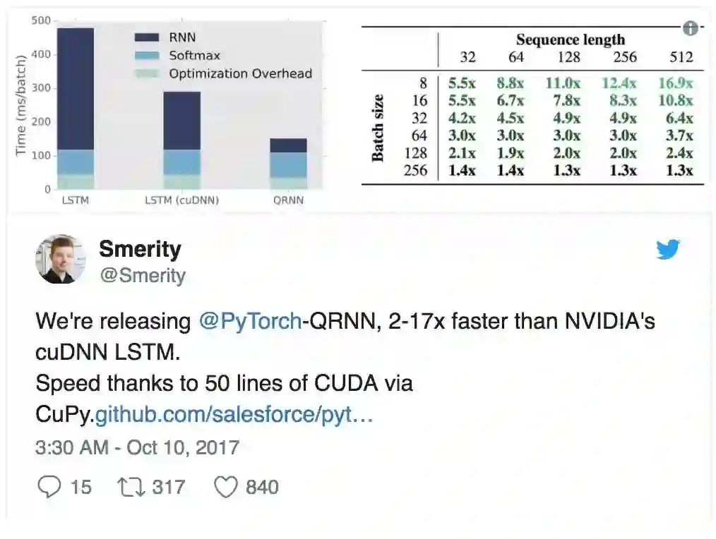 Salesforce 发布了若干个工具包,包括其亮点成果 PyTorch-QRNN,这是一种新型 RNN,相比于 CuDNN 优化的标准 LSTM 可提速 2 到 17 倍。James Bradbury 及其团队是 PyTorch 社区中最活跃和最有吸引力的团队之一。