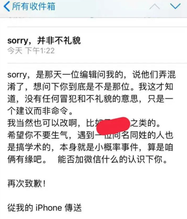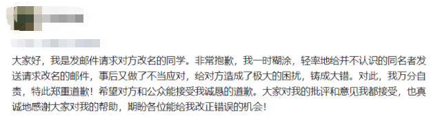 这也让不少学术圈同学觉得好笑,学术圈同名同姓的教授都多了去了,因为你是清华的博士就如此嚣张狂妄吗?事情经过发酵后,这位马同学也及时承认了自己的错误。是自己一时糊涂,轻率的发表了邮件,给对方造成了极大的困扰。