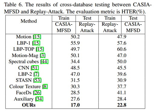 上表可以看出FAS-SGTD在OULU-NPU上结果很不错,再来看下在很具挑战性的跨数据集测试协议上的实验结果:
