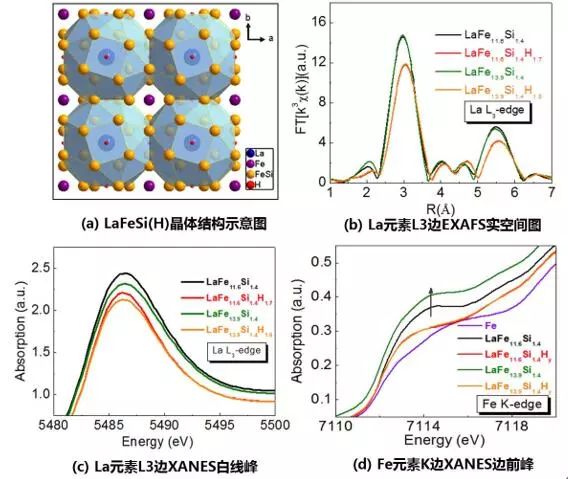 最近,该研究团队利用上海同步辐射光源硬X射线,研究了镧系磁热化合物及其氢化物的晶体结构,在磁体积相变材料中首次建立了局域精细结构与磁性质之间的内在关联。La(Fe,Si)13型化合物由中科院物理所胡凤霞研究员和沈保根院士等人发现,近二十年来,这种巨磁热效应相变材料受到了国际磁学领域的广泛关注,尤其是在其晶格中引入间隙氢原子,可以使材料的居里温度扩展到室温以上,并维持材料本征的巨磁熵变性能,拓宽了材料的制冷温区和应用范围,氢化物已逐渐成为磁制冷样机青睐的实用工质。但关于氢原子占位、氢原子容纳量和居里温度的影响因素等构性关系并没有一致结论。