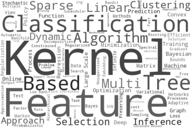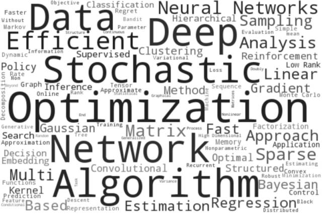 出现在ICML接受的论文标题中的关键词(更大的词意味着它们更常用于标题中。)