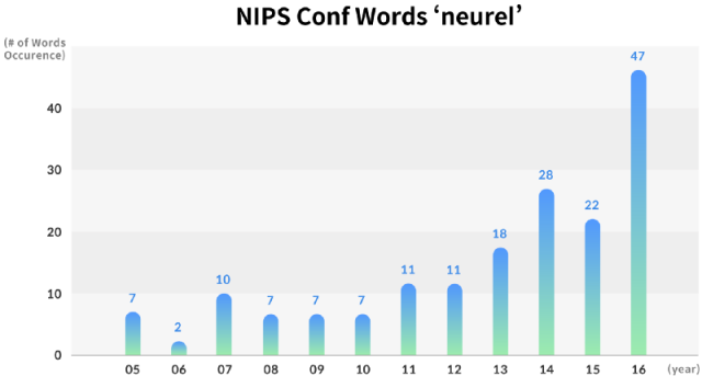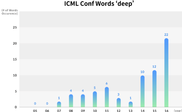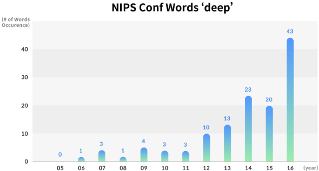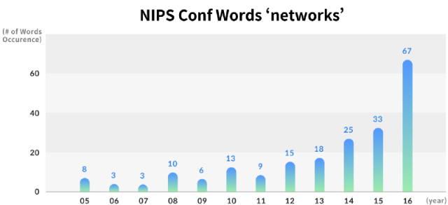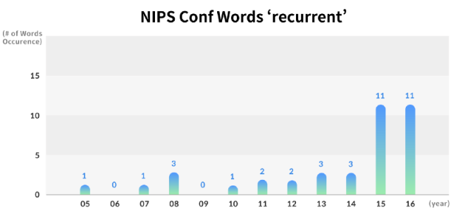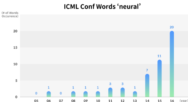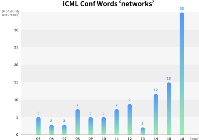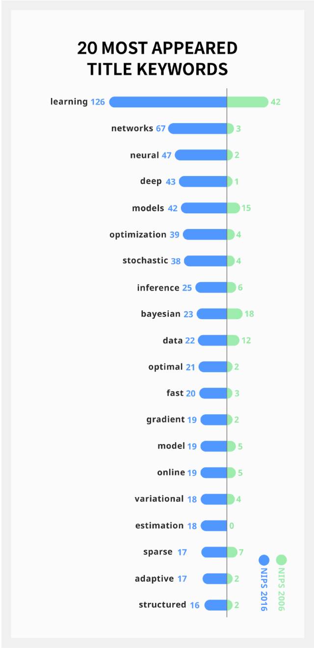 虽然关键字“深度”在ICML中没有出现,但在2006年的NIPS中只出现一次,但在2016年随着“网络”一词成为最显著的关键字,在ICML中出现了22次,在NIPS中出现了43次。