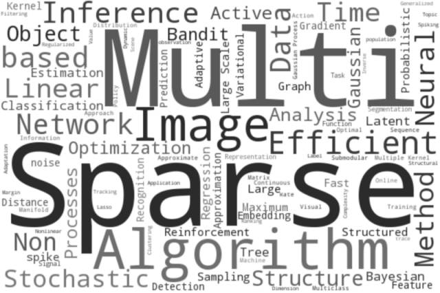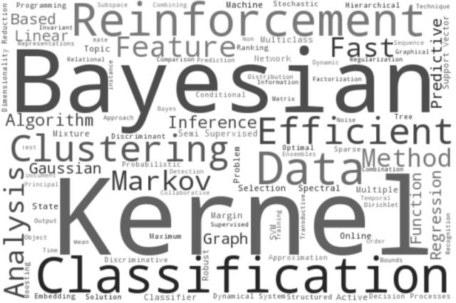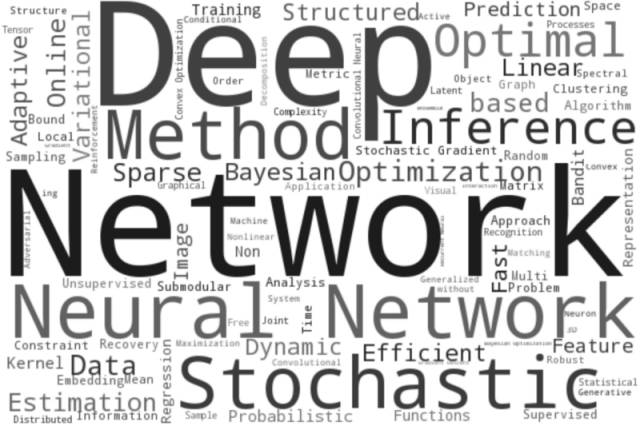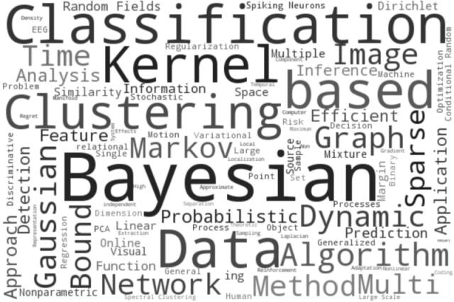 NIPS收录的论文标题中出现的关键字(越大的词意味着它们更常在标题中出现)。