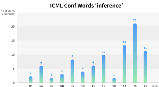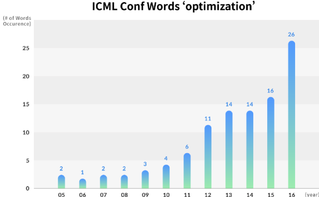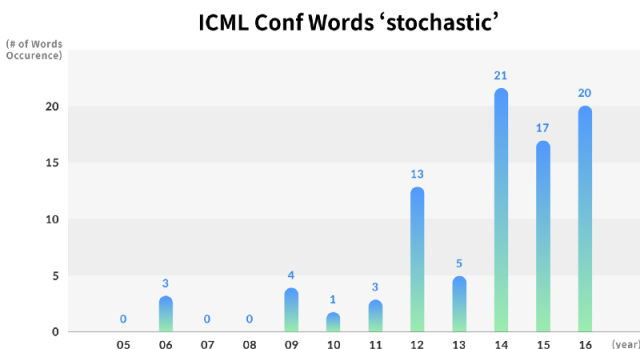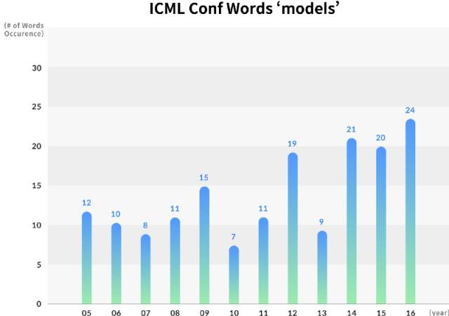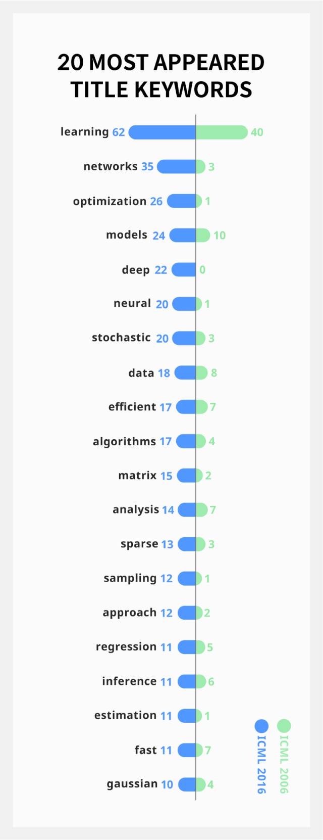 对于ICML收录的论文,2006年论文题目中最常使用的关键词是“贝叶斯”、“核”和“分类”。 但是,2016年收录的论文则频繁出现“网络”、“算法”、“优化”,“深度”等关键词。
