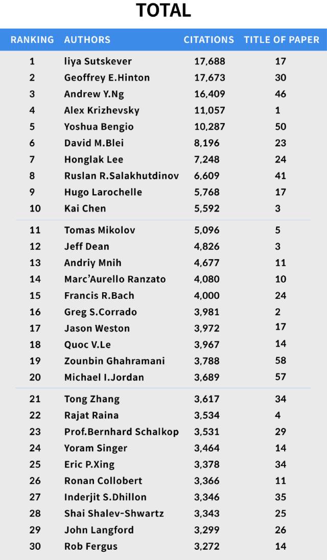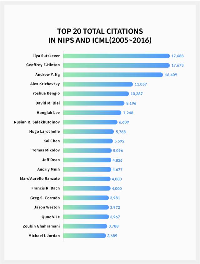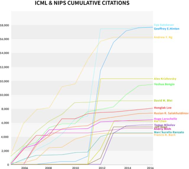 在过去的12年里,ICML和NIPS中累计被引用次数最高的前20名作者