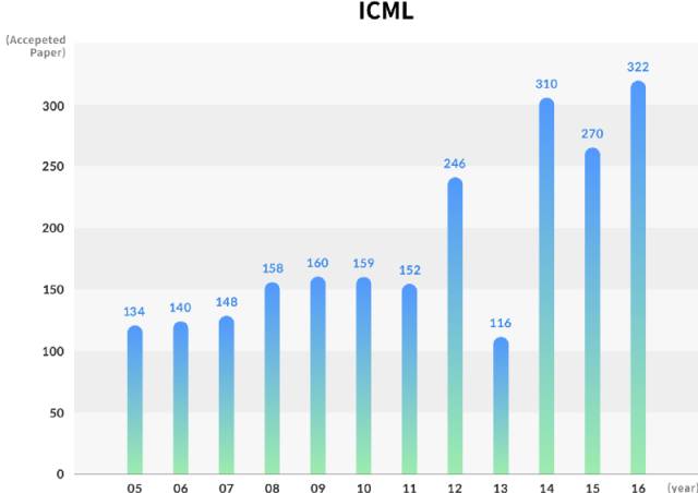 从2005年到2016年,ICML总共接受了2315份论文。2016年接受的论文数量为322篇,比11年前的134篇论文翻了一倍还多。