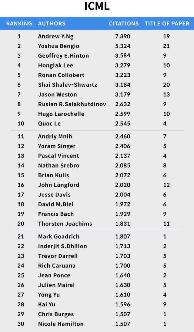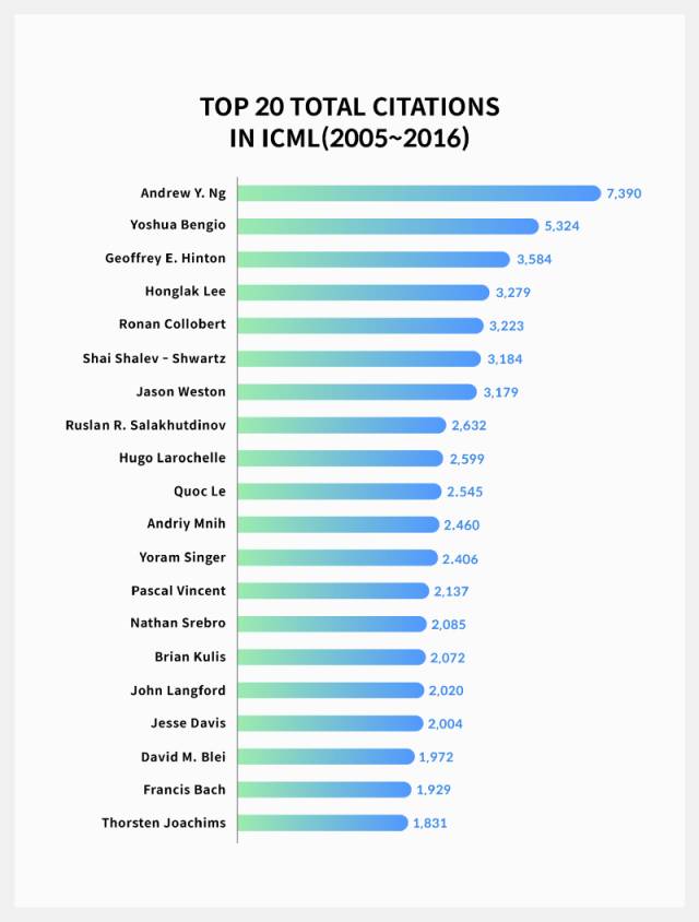 在过去的12年里,ICML中被引用次数最高的前20名作者