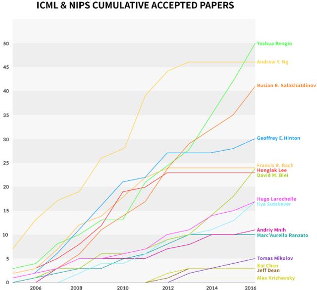 该研究小组调查了在ICM和NIPS中排名前15位的作者的12年变化趋势。之所以选择15个作者的原因是,这个数字可以通过数据可视化显示出最有效的趋势。上面的图表显示了这15位作者的累计引用次数和被接受的论文数量。他们表示,那些在接受论文数量上逐渐变化的作者,每年也会不断地发表论文。在GitHub上可以找到完整的ICML和累计引用的列表。