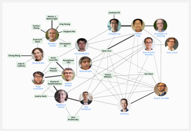 除了Jordan,所谓的AI大神,如Jordan的学生吴达恩,Geoffrey E. Hinton和Yoshua Bengio也占据了网络排名的顶层。在韩国,密歇根大学计算机科学与工程系教授Honglak Lee在ICML排名第十九位,他是在吴恩达的指导下完成博士论文的。
