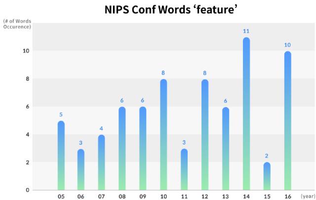 对于NIPS收录的论文,2006年论文题目中最常使用的关键词是“贝叶斯”、“核”、“分类”和“聚类”,与ICML收录的论文中出现的相似。相比之下,“深度”、“自然”、“网络”和“随机”等词在2016年被NIPS收录的论文中出现最为频繁。对这些关键词的考察,我们了解了过去10年研究主题的变化。