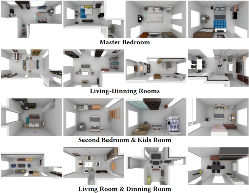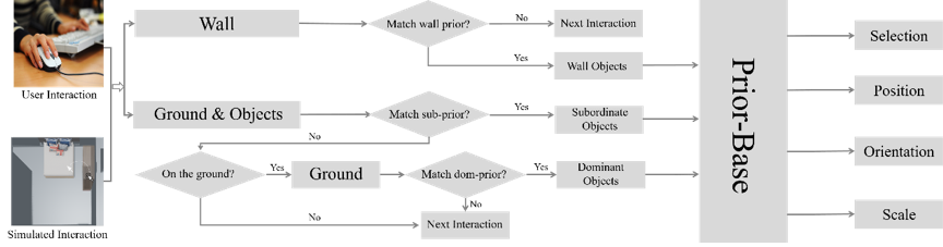 文章的核心之一在于一个实时的框架。上图展示了方法的执行流程,该流程表示每一个鼠标挪动的‘瞬间’。交互的流程分为三个‘分支’,每个‘分支’对应一‘类’物体,每类物体的【先验学习】与【推断】方法均不同。三个类别分别是:主物体、从物体与墙体物体。若鼠标指向墙体,框架则首先匹配墙体物体的先验;若鼠标在其他几何上,框架则尝试匹配从物体的先验。若没有从物体的先验被匹配,则匹配主物体的先验。框架基于从数据集中学习的用于放置不同类型对象的先验知识,这些先验会根据每个特定场景的特定时刻进行定制,从而大大减少计算量。我们每次匹配到一个先验,这个先验都会回答系统:要把那个物体放在哪里,包括物体的选择、平移、旋转、缩放。同时,注意到‘Prior-Base’,这个先验库会基于用户的交互不断更新,比如加入了双人床,会进一步引入床头柜的先验。因此,先验库的维护永远仅仅包含和场景相关的最小先验集合,这也是本文实现实时的原因之一。