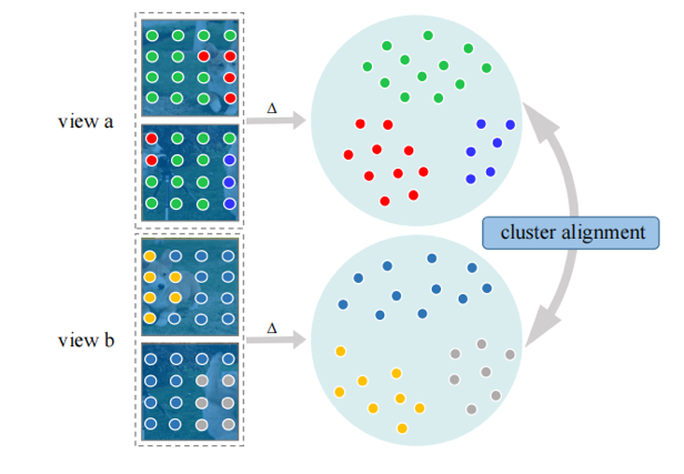 图1是所提出DSC模型的整体框架,包含实例判别、像素判别和语义挖掘三个部分。对于实例和像素的判别,我们进行标准的对比学习。在这两个判别工作之后,有两个问题需要应对。第一个问题,在每个实例中所有像素都被推远(即每张图像),忽略了其固有的像素级别的语义结构。为此我们建议从多个视图中搜索邻居,如图2所示,我们挖掘每个像素的相关样本,理论上,无论是不同视图的增强版本,还是同一视图下的邻居,都应该和当前像素属于同一个语义类别。第二个问题,在经过像素判别之后,不同图像的像素之间仍然没有联系。为此我们尝试使用一些聚类方法在图像之间重新分配每个像素的标签,如图3所示,△代表聚类过程,为简单起见,这里的聚类方法考虑K-means(DSC-KM)和原型映射(DSC-PM)。DSC-KM和DSC-PM对SSL模型施加不同的约束,以探索像素之间的语义决策边界,两者都明确地证实了其有效性。具体来说,DSC-KM要求两个视图下的像素聚类中心是一致的,而DSC-PM强制每个像素的聚类分配是一致的。