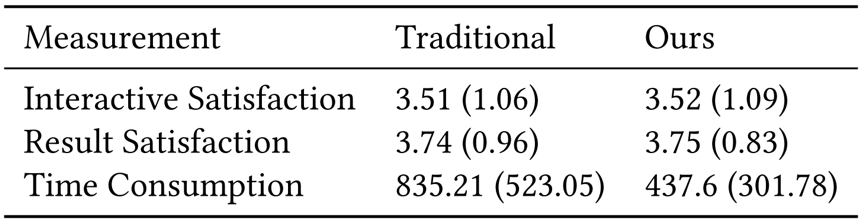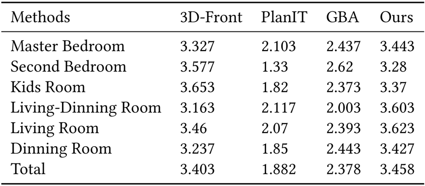 通过实验,我们证明了我们的框架在结果美学方面优于当前已有技术,并且能够实现高效的用户交互。本文的实验分为三个部分,首先通过用户实验比较本文提出的框架与传统的手动场景生成框架,后者即:用户搜索物体、添加物体、微调物体。如表1所示,本文的框架可以大幅度减少场景交互的耗时,并且不会降低交互和结果的质量。如表2所示,我们将方法调整为全自动,并将方法与SOTA的三维场景自动布局方法比较,其结果的美观性与适用性仍然超过已有方法。最后,表三展示了方法的执行效率,方法在效率的‘worst case’时(参考原文),仍能在集成显卡上达到实时。在结尾,展示了文章的演示Demo和渲染后的结果。