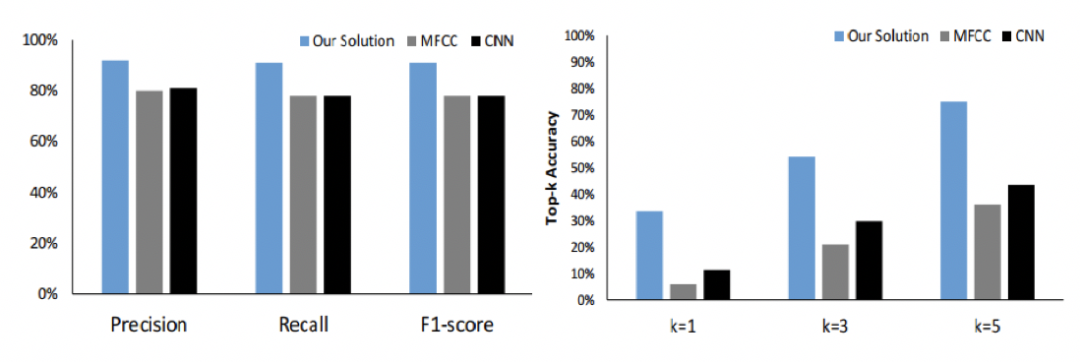 我们复现或遵循官方开源代码重演了其他按键预测方面的工作,并将这些算法的效果与我们提出的方案进行对比,结果如图2所示。从图2中我们发现,我们的算法在以往工作针对的场景中,即掌握一部分训练样本的情况下,能获得更好的准确性。同时,在攻击者面对陌生的攻击场景,未掌握先验知识时,我们的算法取得了更大幅度的准确率提升。这证明了我们的算法更适应细粒度的按键区分任务和侧信道攻击经常需要面对的未知场景,进一步揭示了这种攻击方式对隐私的威胁性。