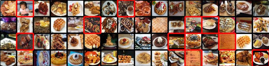 网络爬虫收集的数据往往包含错误的标签。如下图2所示,是Food-101N数据集的图例,这些数据都是在网络上搜索“华夫饼”得到的结果,红色框线标记的是错误的标签。可以看出,从网络中直接搜集的数据并不完全是我们想要的。