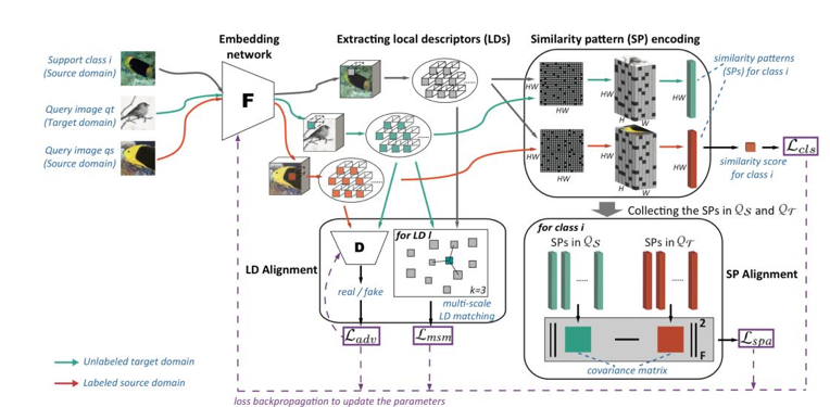 图2展示了相似度模式(SP)的编码器结构。首先,要计算图像到类的相似度矩阵。其次,通过每行保留最大K个值的方式稀疏化该矩阵,并将其按照图像的空间位置进行排布。最终,经过高斯滤波和池化,得到了最终的相似度模式向量。该编码过程通过稀疏化的方式提高了判别性,同时考虑到了图像的空间特性,并通过高斯滤波实现了去噪,使得它可以用于高效的小样本图像分类。正是由于相似度模式包含了丰富的高层语义信息,它可以用于跨域对齐,本文通过计算源域和目标域相似度模式的协方差矩阵,并减小二者的差异,以达到相似度模式分布信息的对齐。