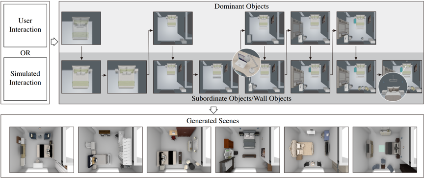 本文提出了一种实时的、交互式的三维场景构建方法,其核心之一在于“让用户可以控制自动生成布局的流程”。当前三维场景自动合成已经取得了令人印象深刻的成果,它侧重于满足人们对布局的共性习惯,但未考虑用户的个人偏好,仍需通过交互来满足用户个性化的需求。针对此问题,本文提出了一个数据驱动的三维场景交互合成方法,可以根据用户已确定的场景对象(用户偏好)和对象关联关系先验,实时推荐用户感兴趣的对象,通过最低限度的鼠标指针输入,智能地将物体推荐到鼠标指针指向的场景中,从而实现场景自动合成与用户偏好输入的无缝融合。