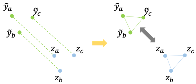 图5 结构相似性示意图。左:变换\hat{y}—>z;右:变换后样本间关系保持相似。