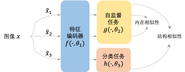 图3 Co-learning通用算法框架,由自监督和分类两个任务协同完成,在保持各环节数据自身内在特征相似性的同时,保持两个任务变换后特征的整体分布结构相似性。