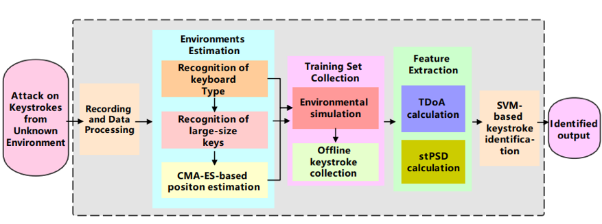 图1 一次完整的对按键的侧信道攻击流程。输入为一系列未知的按键声学信号,经过数据预处理、环境估计算法、模拟训练集收集、数据提取和模型训练,最终输出按键标签。