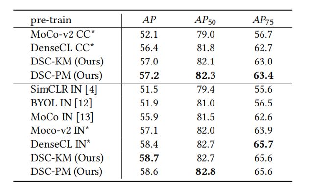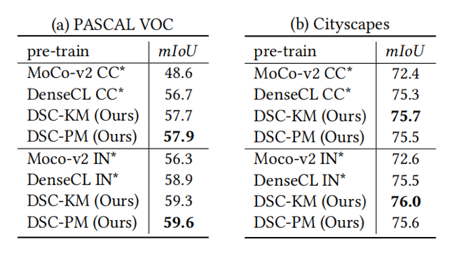 DSC分别在ImageNet和MS COCO上进行了预训练,在不同数据集上的目标检测和分割任务上进行了评估(表1、表2、表3)。CC and IN分别表示在MS COCO和ImageNet上预训练的模型,*表示复现结果。可以看出,所提方法在各种下游密集预测任务上的性能,均超过了SOTA(DenseCL)和baseline(MoCo-v2),显示出DSC的有效性。如图4所示,我们在PASCAL VOC语义分割任务上,可视化了在MS COCO微调任务上不同模型的可迁移性。DSC模型使得分割任务的性能变得更好,再次证明了我们的语义挖掘方法对于下游密集预测任务的有效性。